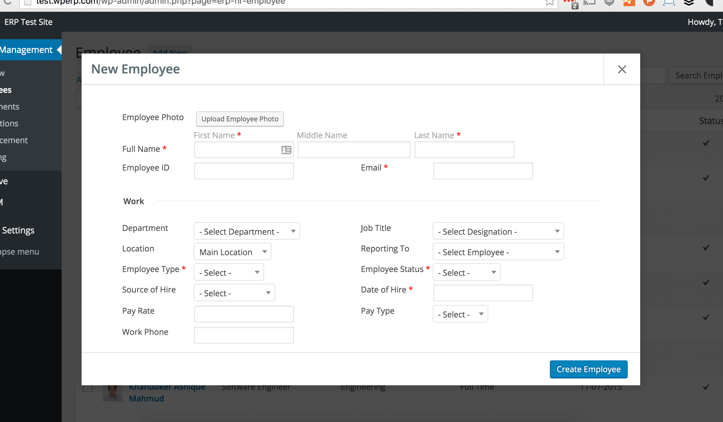 WP ERP 是一个 weDevs 开发的一个基于 WordPress 企业资源管理系统的开源插件。该插件提供了基本够用的企业资源管理功能,期中包括:HR 人力资源管理模块、CRM 销售管理模块、记账系统 – 一个免费、功能丰富的复式记账系统、通过 WP Project Manager 插件提供的项目管理模块。 WP ERP 插件的官网 列出了该插件功能的详细介绍,并提供了演示地址。阅读英文没问题的朋友可以直接到官网了解。下图是 WP ERP 插件录入员工资料的截图,从图中我们可以看出,插件提供的数据字段非常丰富。
