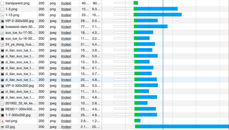 设置了 CDN 后,我们再查看网络请求瀑布图,会发现,有更多的资源一起下载了。这么多资源齐刷刷的左对齐,强迫症看起来应该会很舒服。
