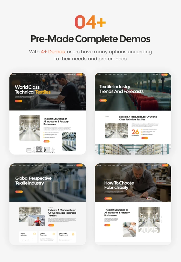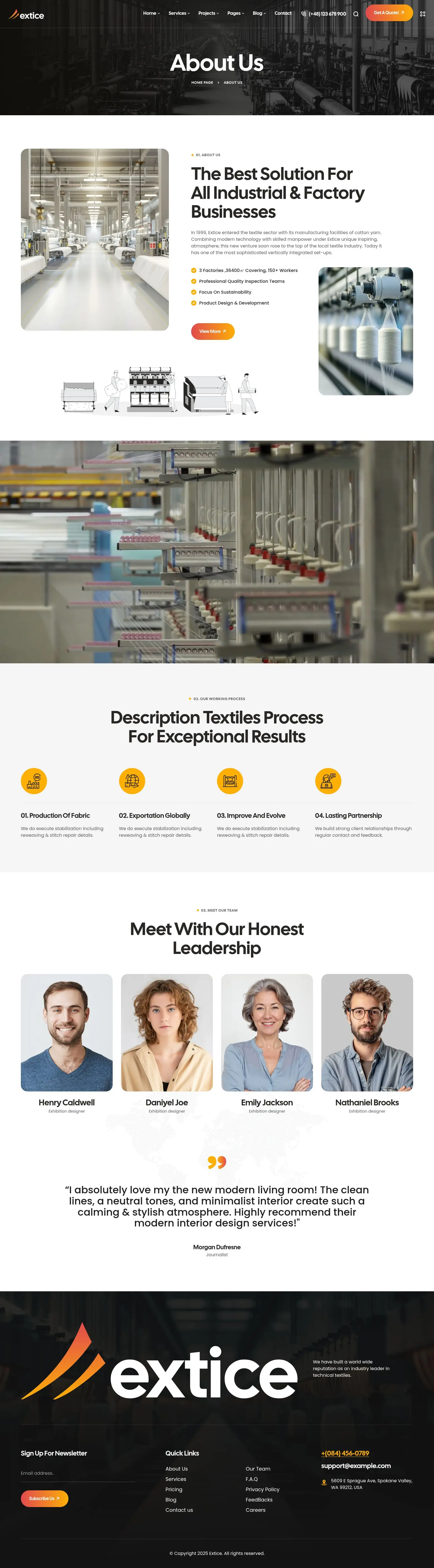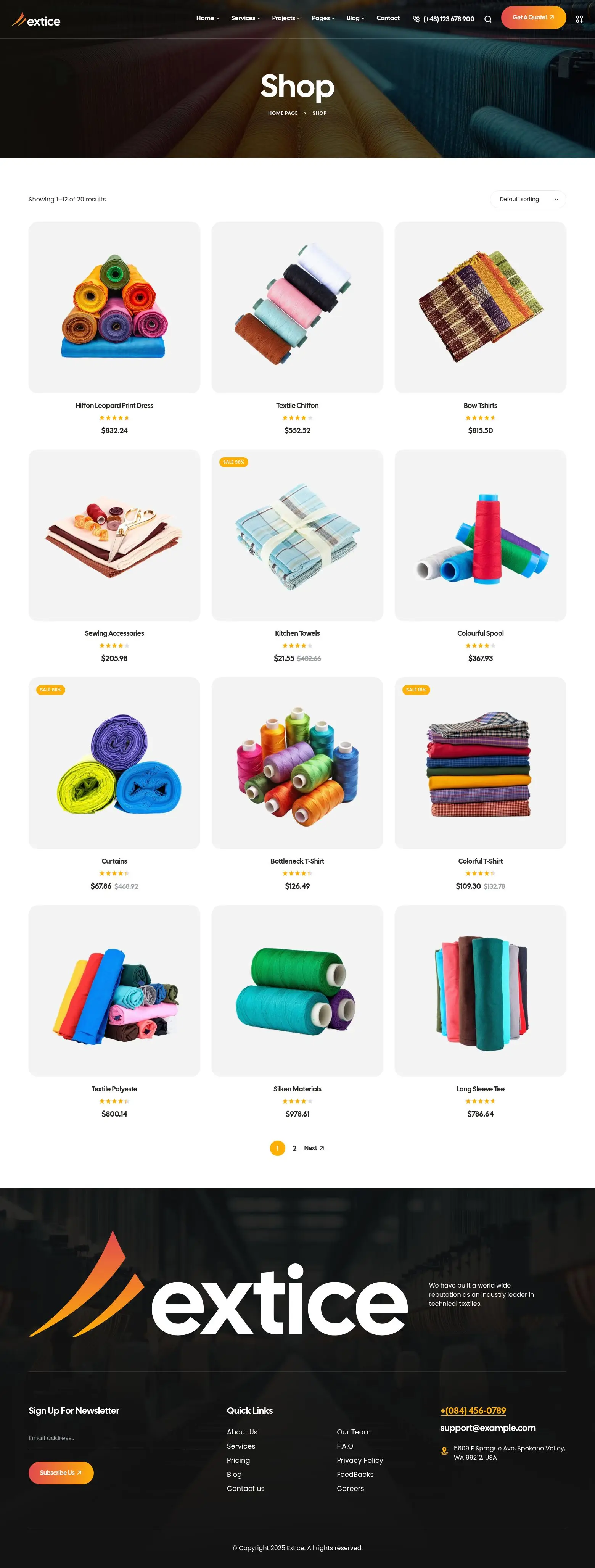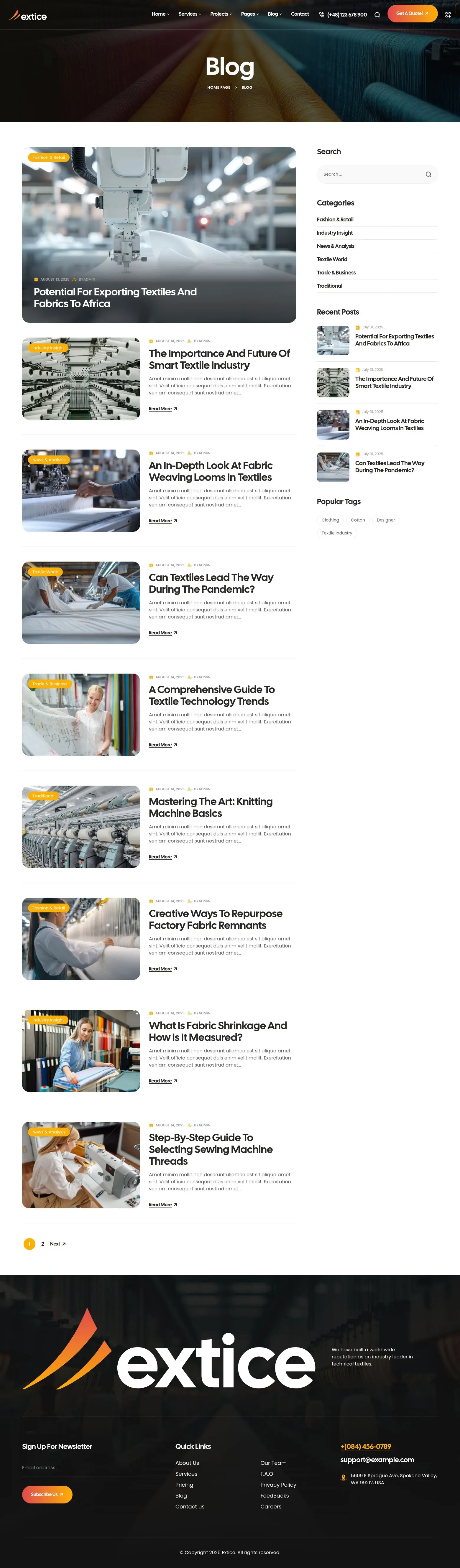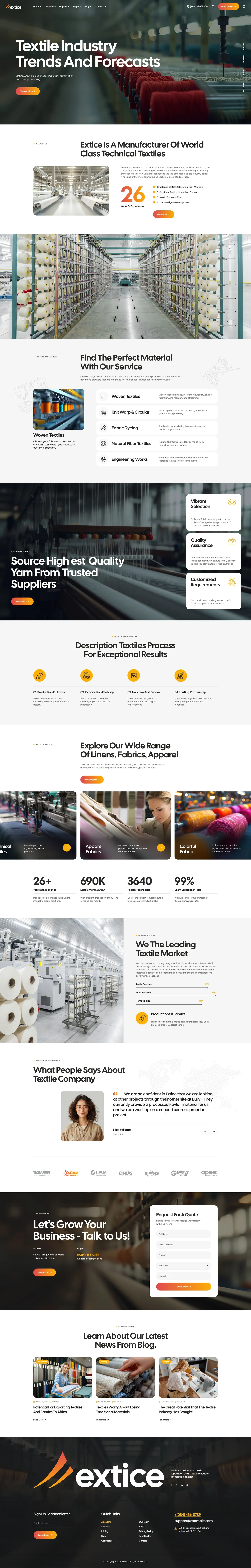 Extice – Textile Industry 是一款专为纺织制造业设计的 WordPress 主题。该主题不仅适合传统纺织企业,更是想要建立专业在线形象的营销人员的理想选择。无论你是服装制造商、面料供应商还是纺织设备企业,该主题都能帮你快速搭建一个专业的 WordPress 网站。