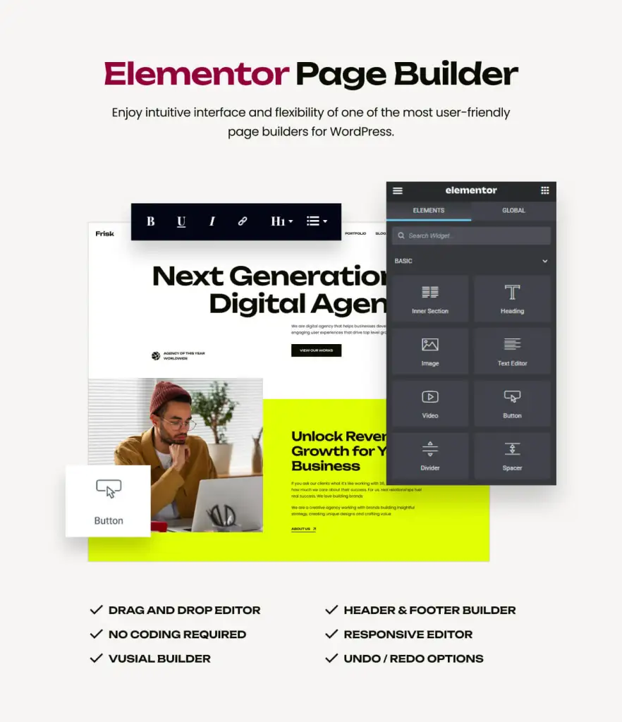 Frisk 主题包含30多个 Elementor 自定义区块,可以轻松根据自己的需要定制首页或其他页面。