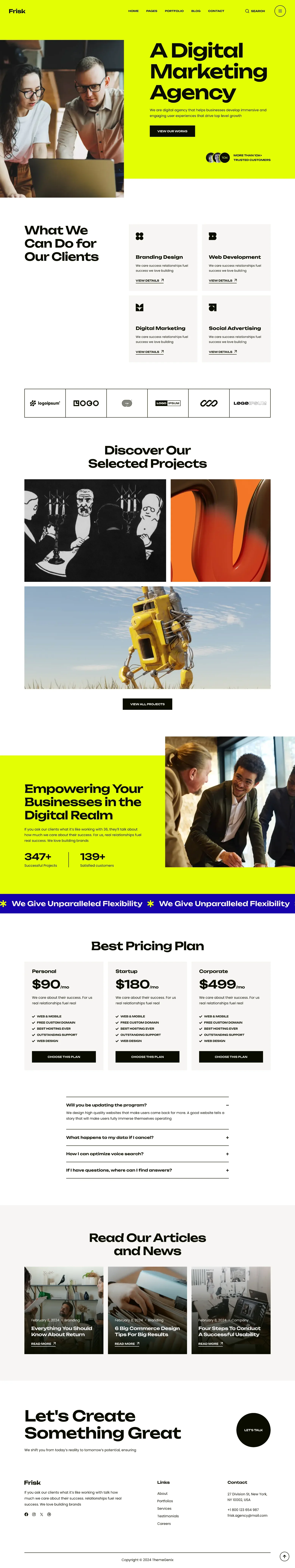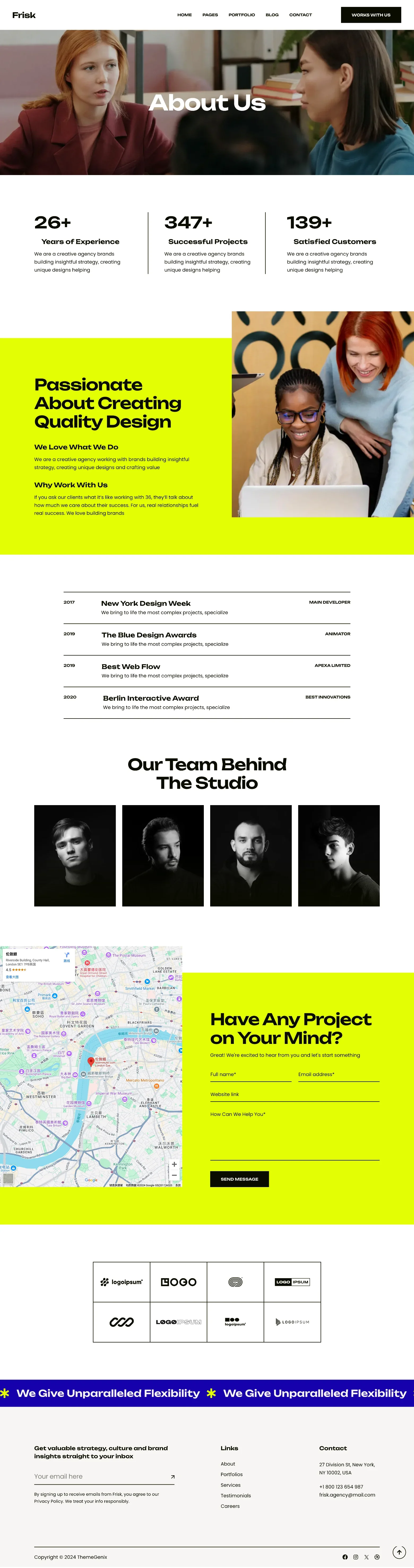 Frisk是一款优质、时尚、现代的 WordPress 主题,适用于创意机构和作品集网站。在艺术和创意行业,拥有作品集几乎是必需的。摄影师、插画家、平面艺术家、书法家、艺术家和工匠都将作品集作为营销自己的主要方式。因此,拥有一份出色的作品集非常重要。在这种情况下,Frisk 是完美的解决方案。该主题包含 8 个不同的主页演示,其中包含 30 多个精心设计的内页区块,易于编辑和自定义以满足您的需求。