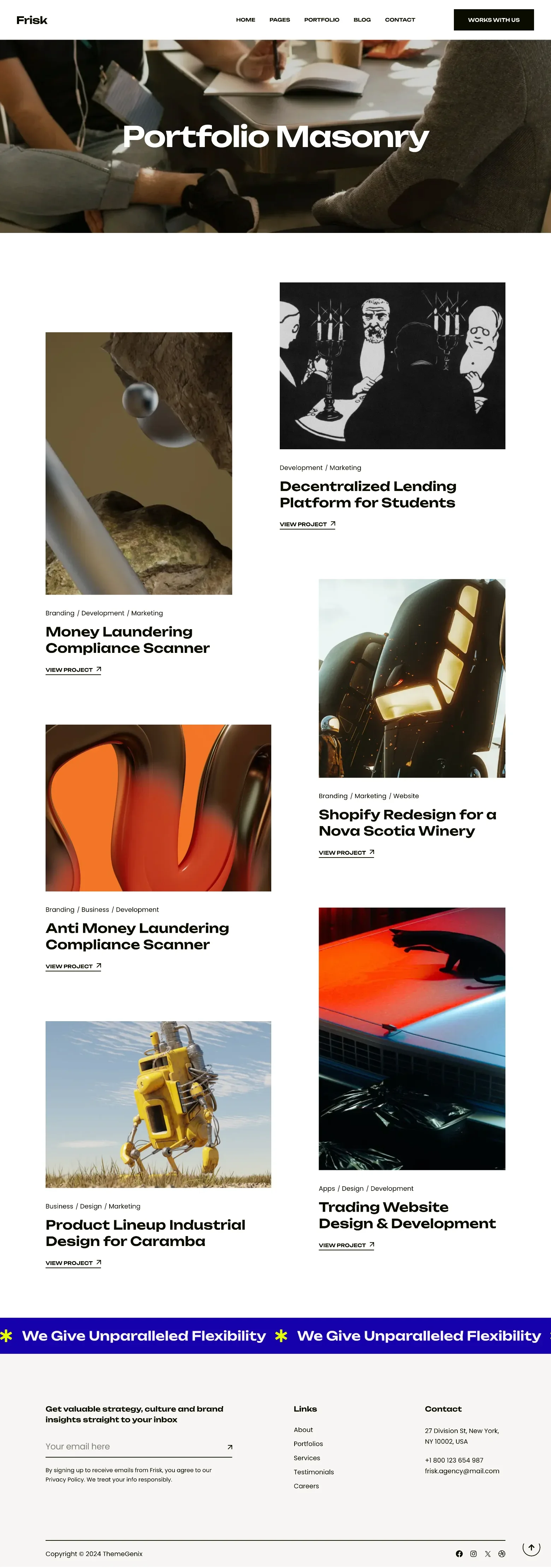 作为一个作品集主题、Frisk 内置了多种形式的作品集页面模板,方式使用者根据自己的作品集类型,选择最合适的作品集展示方式。