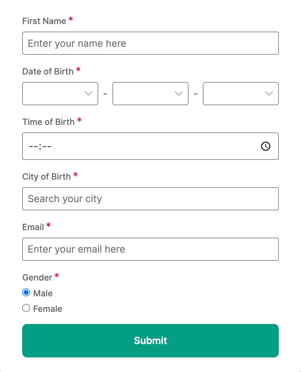 支持收集用户的基本信息,用户占星和营销,包括:姓名、出生日期、出生时间、出生地点(城市)、电子邮箱、性别等信息