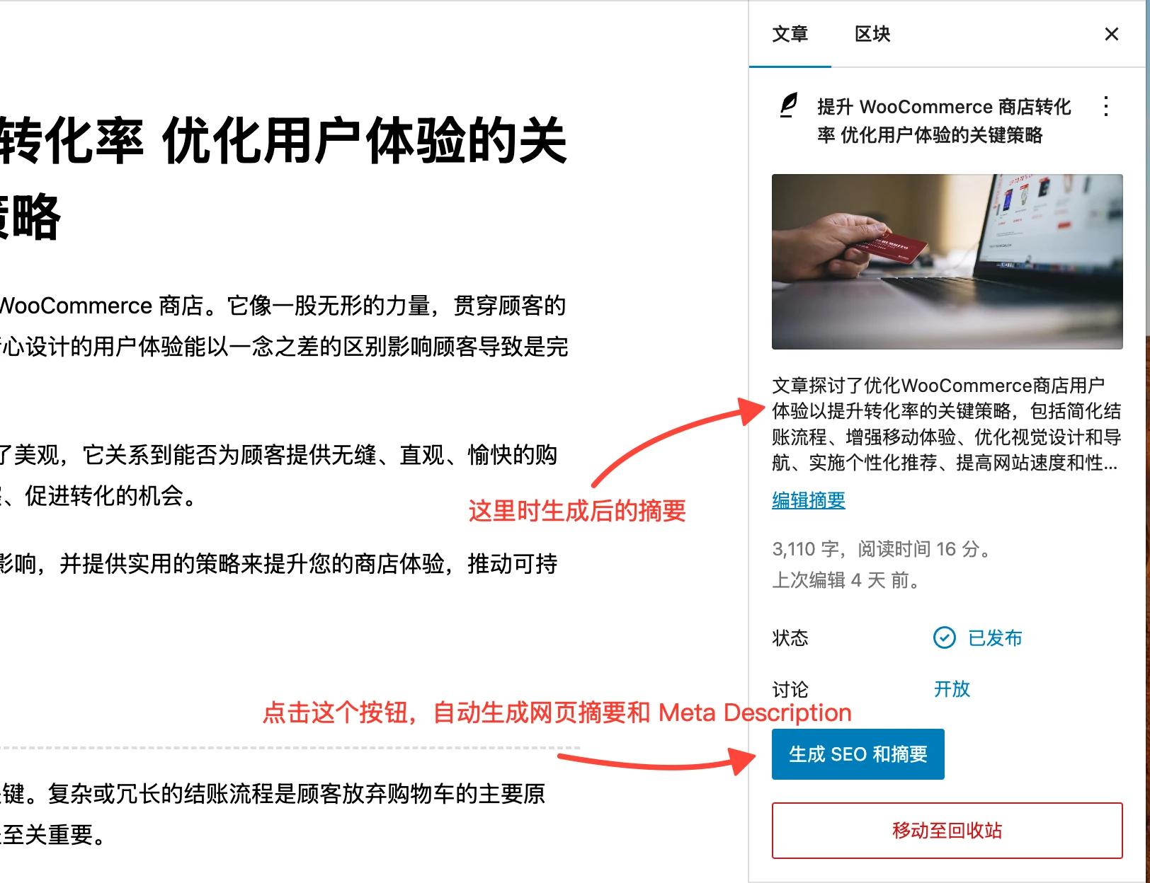 以往我们做SEO 的时候,都需要手动撰写网页摘要,不但效率低,总结出来的摘要还不总能全面概括网页内容。有了 WP AI SEO 插件,写好文章后,我们只需要点击一下,就可以自动生成网页摘要了,大大提升了 SEO 内容优化的效率。