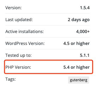 和主题不同,WordPress 已经在官方插件目录中直接列出了插件的 PHP 版本需求,我们可以直接在插件介绍页面右侧的插件元信息中查看,如下图: